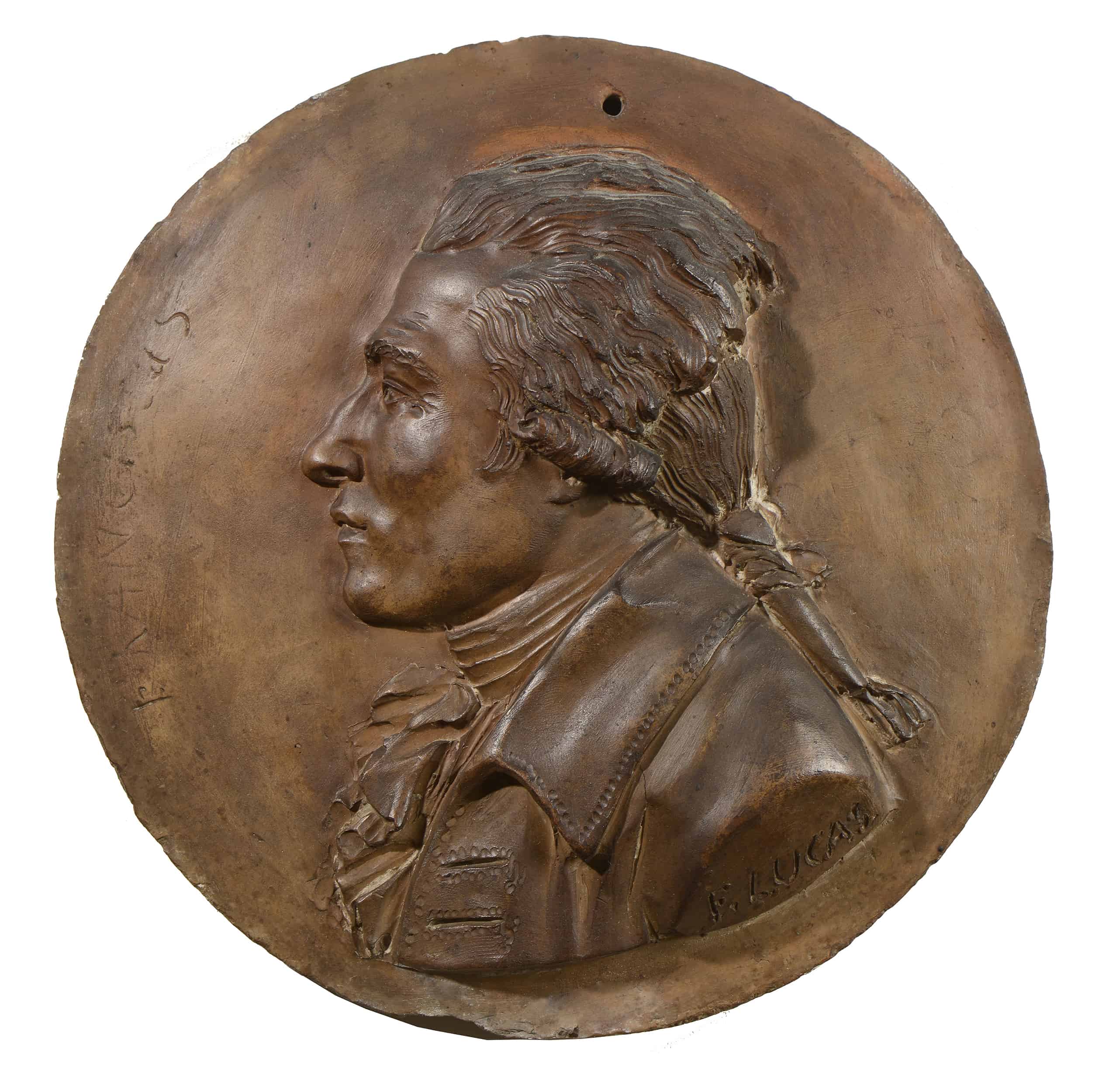 Si Lucas s’est enorgueilli d’avoir été le premier sculpteur toulousain à produire un grand nombre d’œuvres en marbre[1], il est aussi réputé pour ses sculptures en terre cuite, comme l’attestent les rares vestiges, conservés au musée des Augustins de Toulouse, de l’important ensemble de sculptures réalisées pour le baron Jean-Charles Ledesme, entre 1762 et 1798, pour les jardins et le château de Saint-Élix, près de Toulouse. Plus rares sont les portraits modelés en terre, comme notre Portrait d’homme, qui témoigne, par son format, du goût pour le « portrait à la silhouette » dont la vogue étonnante et rapide se répand à partir de 1760. Héritée des médailles et des pièces antiques, cette forme de portrait se développe aussi bien dans le domaine du dessin, de l’estampe que de la miniature. Pour ce qui est de la sculpture, l’artiste italien Giovan Battista Nini fut probablement le premier à adapter la représentation de profil à un support fragile et précieux comme la terre cuite. Bien plus tard, cette idée sera reprise, sur une grande échelle et en bronze, par David d’Angers, Barre ou Préault. Notre inconnu (le nom, malheureusement illisible aujourd’hui, était inscrit le long de la bordure), de profil à gauche, le front haut et le regard perdu dans le lointain, est vêtu avec recherche d’un habit et d’une chemise à cravate. Sa coiffure en catogan[2], aux cheveux ramenés sur la nuque et noués par un mince ruban, est typique de la période révolutionnaire. Au-dessus de cette coiffure, on distingue encore le petit trou qui permettait, à l’époque, de fixer directement l’œuvre au mur, sans cadre. L’utilisation de la terre cuite, plus propice que le marbre à exprimer la spontanéité du geste de l’artiste, permet à Lucas d’exprimer l’intelligence et la concentration du modèle. La finesse des détails retravaillés avec attention et patience à la pointe de l’ébauchoir, comme la chevelure ou le contour de l’œil, font de cette sculpture une miniature exquise et, très probablement, un hommage affectueux de l’artiste à son modèle qui devait être un intime.
