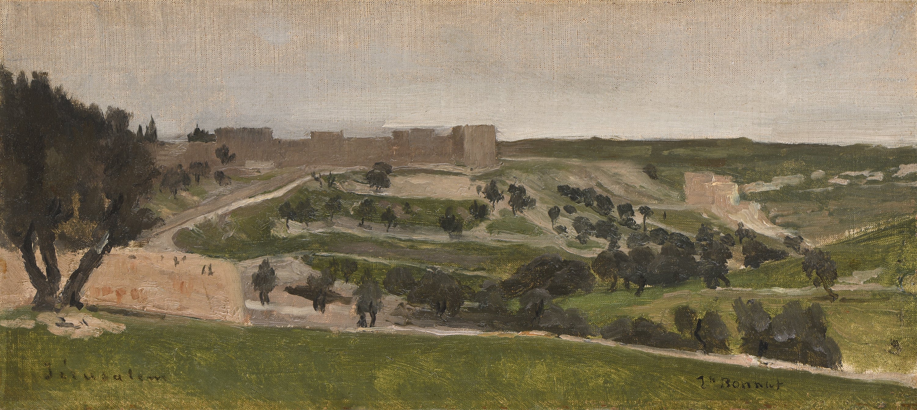 En 1868, Jean-Léon Gérôme organise un voyage d’étude au Moyen-Orient pour un groupe d’artistes : Léon Bonnat en fait partie. En janvier, le groupe quitte Marseille pour naviguer vers Alexandrie, avant d’arriver au Caire. De là, après avoir visité le monastère Sainte-Catherine dans le Sinaï puis Pétra, ils arrivent devant Jérusalem le 3 avril. Dans son journal, l’artiste hollandais Willem de Famars Testas, un des participants au voyage, note à cette date : « Le premier aspect de Jérusalem était saisissant : la ville éclairée par le soleil, se détachait sur un ciel d’orage violet, le paysage environnant enveloppé dans l’ombre des nuages[1]. » C’est sous le choc de cette découverte que Bonnat réalise quelques rares vues de Jérusalem dont deux seulement représentant les murailles de la cité, celle que nous présentons et une vue conservée en collection particulière[2]. Ici, il a installé son chevalet au sommet du faubourg de Mishkenot Sha’ananim, premier quartier juif construit à l’extérieur des murs de Jérusalem à partir de 1860. Au loin, l’angle sud-ouest des fortifications ottomanes de la vieille ville ; tout autour, des champs d’oliviers[3]. Rapidement brossée sur le motif, avec une gamme de coloris restreinte à un jeu de bleu, ocre et vert d’un raffinement extrême, baignée d’une lumière forte qui évoque parfaitement l’éclat du Proche-Orient, notre Vue de Jérusalem révèle ainsi la sensibilité toute particulière de Léon Bonnat pour le paysage, l’une des expressions les moins connues de son œuvre.