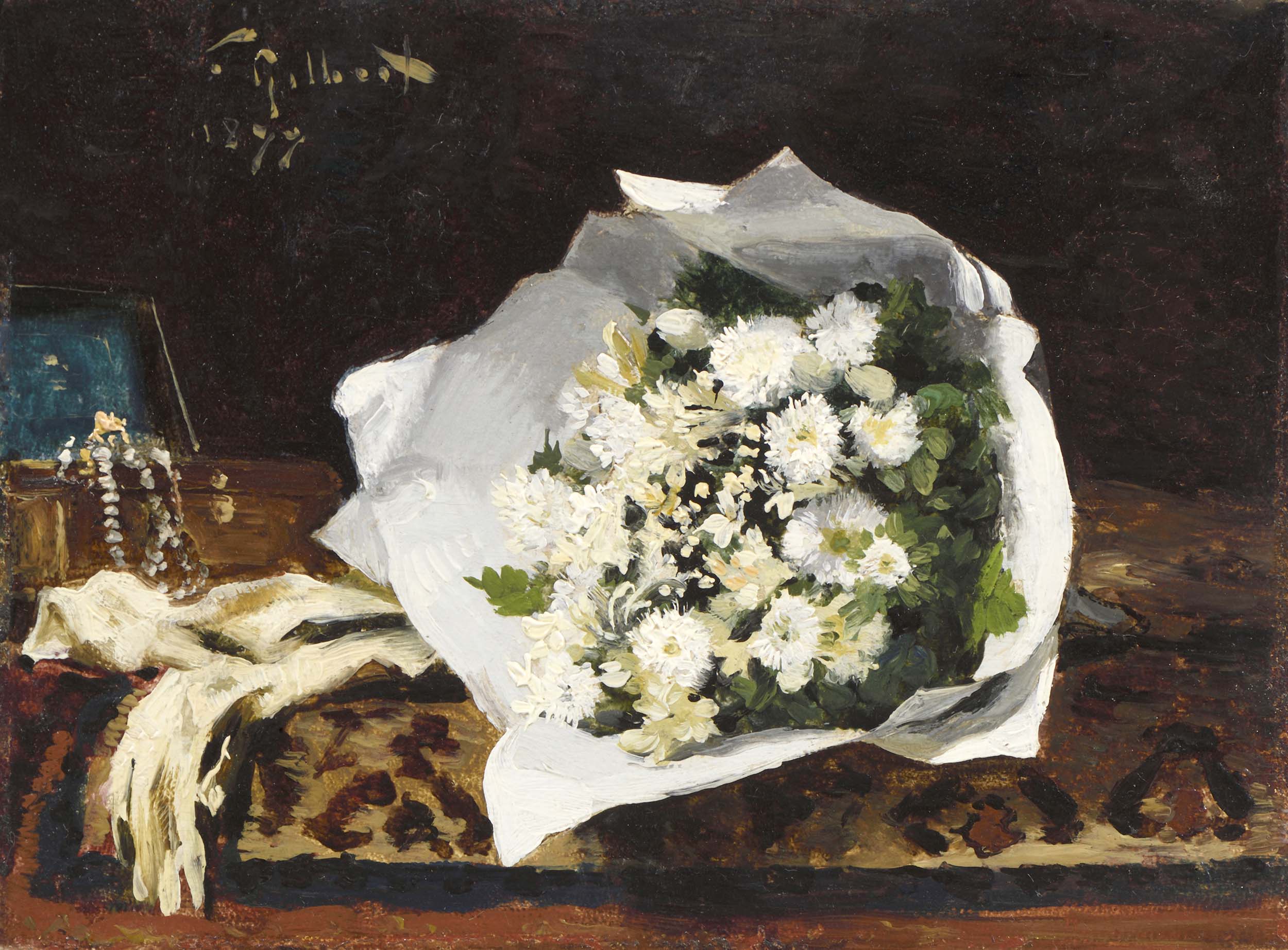 En dehors de ses scènes des Halles, Gilbert s’est plu à représenter les marchés aux fleurs parisiens, comme dans Le Marché aux fleurs de la Madeleine (collection particulière). Il réalise également, à la même époque, de petites natures mortes pleines de charme comme ce Bouquet de coquelicots (collection particulière) ou notre Bouquet blanc. Posé sur un rebord de table couvert de tissu, un bouquet voisine avec une paire de gants et une boite à bijoux. C’est probablement le pendant – féminin – d’un panneau de mêmes dimensions représentant également un bouquet posé sur une table mais avec des gants d’homme, un chapeau haut-de-forme et une canne (collection particulière)[1]. C’est l’opposition entre l’ombre et la lumière – le noir du fond et le blanc des fleurs, du papier et des gants –, et ce clair-obscur incertain que Gilbert cherche à saisir. Et cette véritable étude de matière où l’artiste tire parti de la cassure d’un pli, d’une ombre portée ou d’un effet de reflet sur le papier permet à Gilbert de rendre toute la subtilité d’un univers clos.