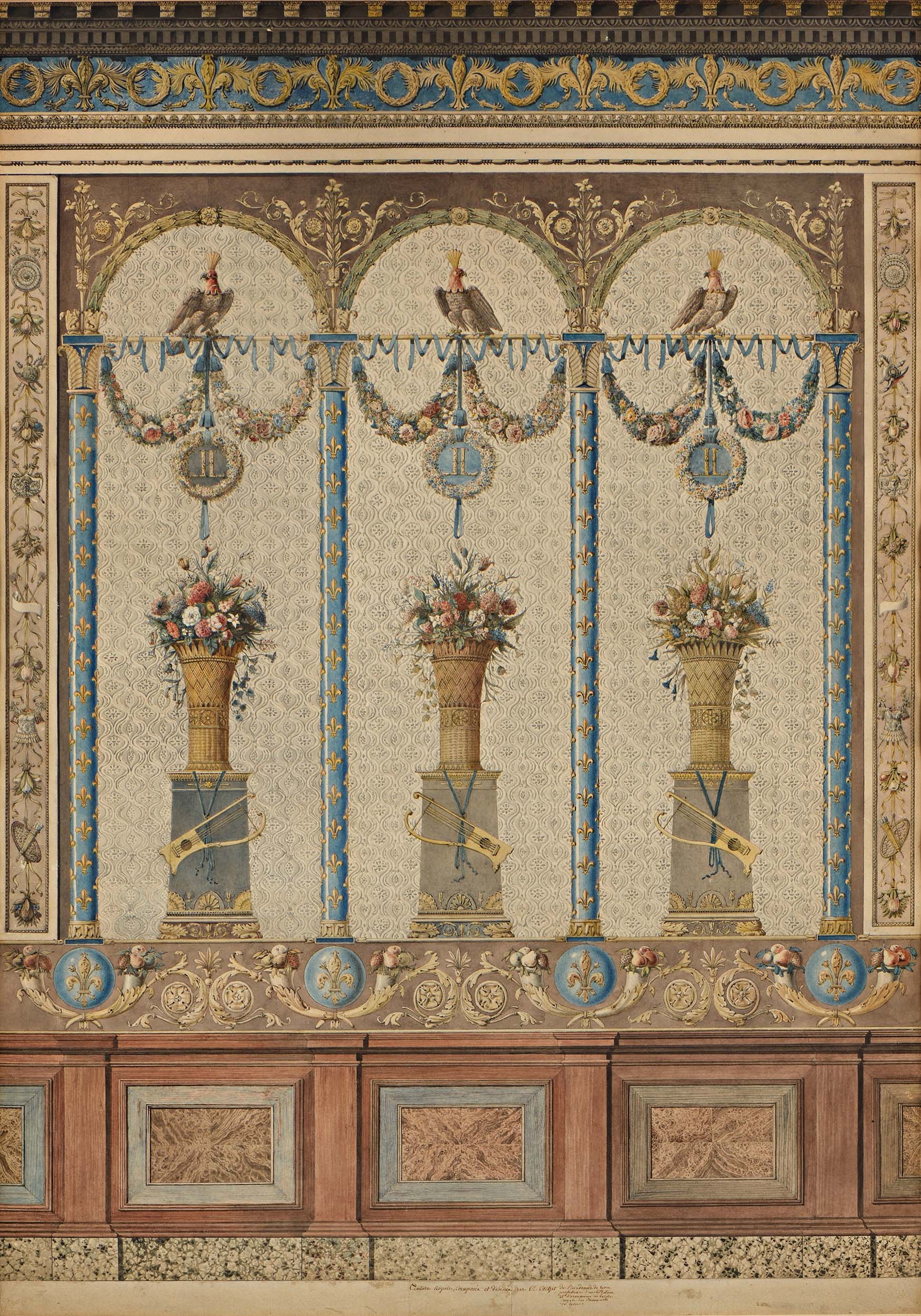 Plume et encre de Chine, lavis d’encre de Chine et aquarelle 840 x 590 mm Signé et annoté en bas au centre : Tenture Royale composée et dessinée par Cl. Cochet, de l’Académie de Lyon / Professeur d’architecture et d’ornements à l’École / Royale des Beaux-Arts de Lyon