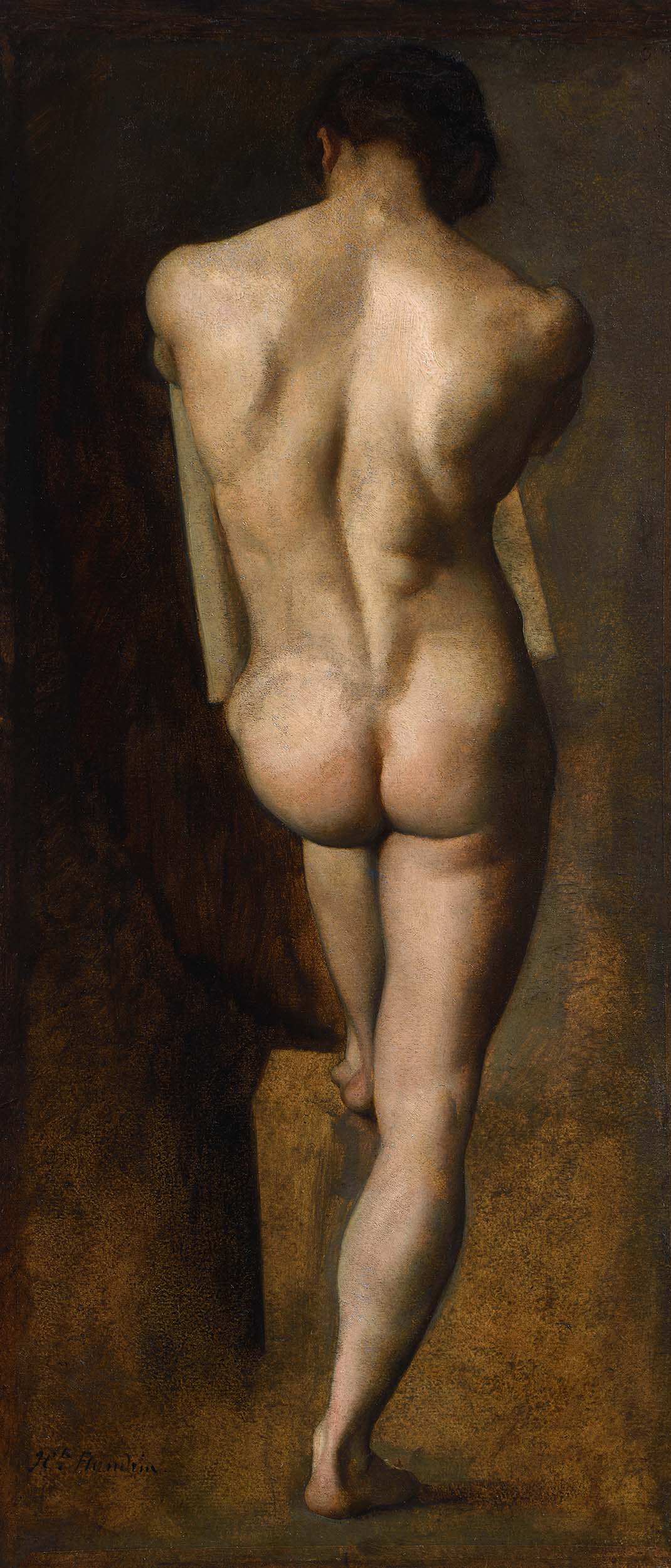 Dans l’atelier de Jean Auguste Dominique Ingres, où Hippolyte Flandrin étudie de 1829 à son départ pour Rome en 1833, l’étude du modèle nu est une pratique fondamentale. Le modèle, exclusivement masculin et dont la pose est mise en scène par le maître, est généralement représenté à la pierre noire ou à la sanguine sur papier. Les académies d’Hippolyte Flandrin présentent la particularité d’être peintes à l’huile sur papier, une pratique plus rare à cette époque. Jusqu’à peu conservées dans le fond d’atelier de l’artiste soigneusement préservé par la famille Flandrin, ces études sont aujourd’hui dispersées entre le musée des Beaux-Arts de Troyes (Berger flutiste et Personnage debout, datés 1831), le Metropolitan Museum de New York[1] et des collections particulières. Toutes ont en commun une figure soigneusement peinte sur un fond sommairement esquissé qui laisse apparaître le papier en réserve. Certaines de ces académies ont parfois été attribuées à Paul Flandrin, le frère d’Hippolyte, mais notre huile sur papier est la seule a être clairement signée H. Flandrin, ce qui montre qu’une partie essentielle de ce groupe a été réalisé par Hippolyte. Le primat de la ligne sur les couleurs reflète l’influence d’Ingres et de son esthétique sur ses élèves. Mais le chromatisme adouci, rose et gris, atteste d’une recherche subtile dans le rendu de la lumière qui est typique de l’art d’Hippolyte Flandrin. Cette perfection dans le rendu du modelé, cette virtuosité des effets lumineux se retrouvent dans d’autres nus réalisés par Flandrin dans sa jeunesse dont le plus connu est son envoi de quatrième année de pensionnat à Rome, Le Jeune homme nu au bord de la mer (1836, Paris, musée du Louvre).