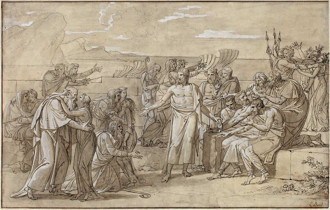 Notre dessin constitue une étude préparatoire au Bias rachetant les esclaves, un tableau que la mort du peintre laisse inachevé, où la composition n’était que dessinée sur la toile, à l’exception du centre, unique partie peinte. Un tableau dont le souvenir se maintient par un fragment, aujourd’hui coupé en deux morceaux (collection particulière) et une esquisse (collection particulière, fig. 1). Pour cette composition, Meynier exécute plusieurs études préparatoires, mentionnés dans le catalogue de la vente après décès de l’artiste sous le numéro 35 : « Trois forts beaux dessins à la sépia, rehaussés de blanc ; pensées du tableau que faisait M. Meynier quand la mort l’a surpris. Ces compositions sont d’un style élevé, et les figures d’une grande pureté de dessin. » Notre dessin est l’un de ces trois dessins.