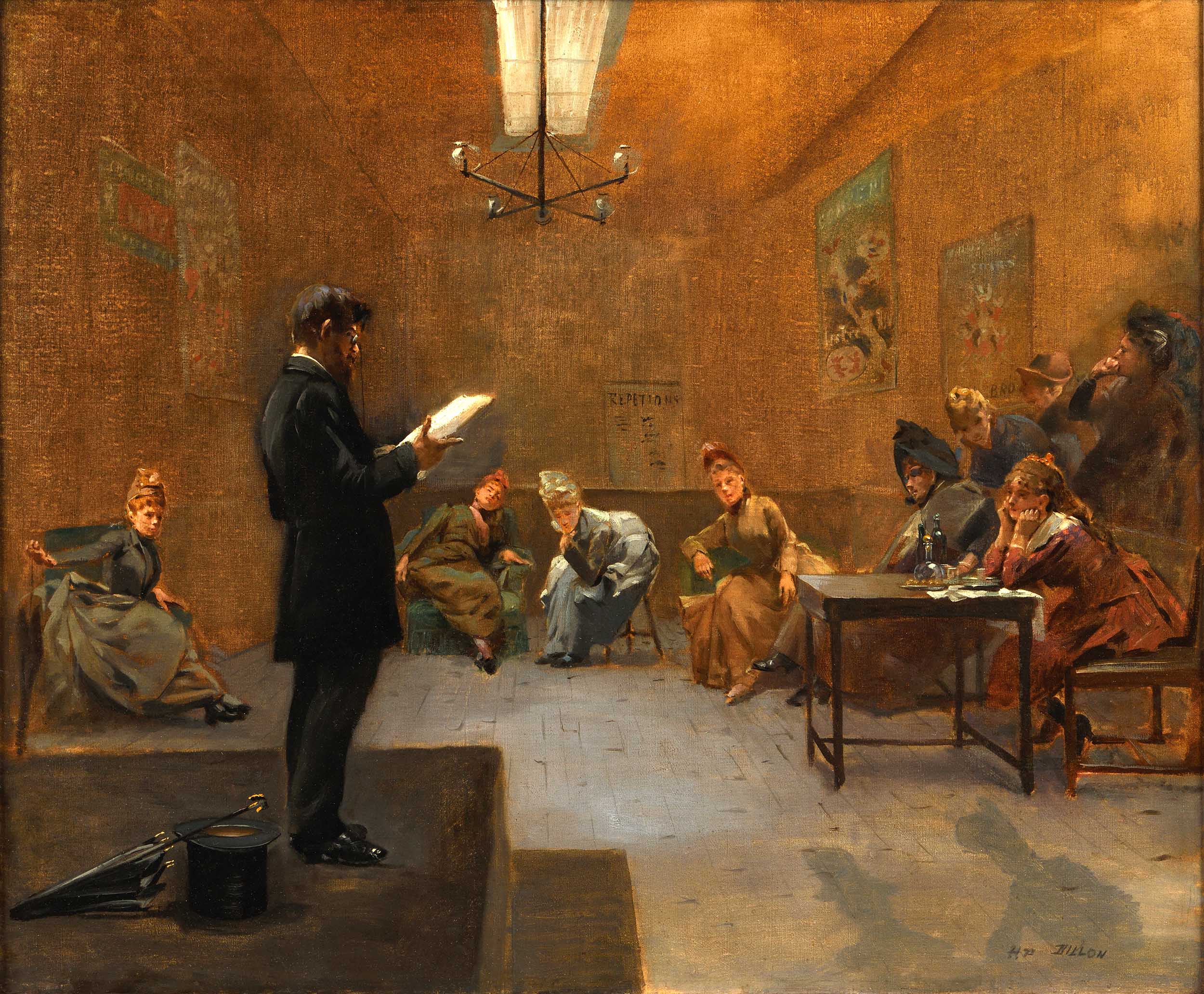Dans notre tableau, Dillon situe la scène avant les représentations, et même avant les répétitions : dans une salle aux murs nus, quelques affiches annoncent concerts et répétitions ; à l’éclairage succinct, neuf personnages féminins écoutent attentivement un jeune homme leur soumettant une pièce. Les neuf femmes correspondent aux différents rôles de la pièce d’Alexis : Mme Nancy Vernet, qui va jouer Lucie Pellegrin ; Félicia Mallet, le rôle de son amante Chocotte ; Mme Louise France, qui interprètera la concierge Mme Printemps ; Lucy Léonce, Odette Delpré, Mme Andrée et Luce Colas, qui seront les amies de Lucie ; et Mme Barny, sa tante. Il faut souligner la grande modernité de la pièce, qui ne comprend que des rôles féminins. On remarque également, au premier plan, deux ombres projetées — celles d’un homme et d’une femme — que l’on peut identifier comme celles de l’auteur et de sa femme, venus assister à la lecture. Dillon traite cette assemblée dans un style à la fois réaliste et légèrement inachevé, employant un camaïeu de gris précieux, de noirs profonds et de bruns délicats qui n’est pas sans évoquer l’art d’Édouard Manet. Un an plus tard, il réalise une autre œuvre sur le même thème, mais dans un format supérieur : La Répétition de « La Sérénade » de Jean Jullien, au Théâtre-Libre, qui obtient un grand succès (huile sur toile, 97 × 126 cm, Paris, musée Carnavalet).