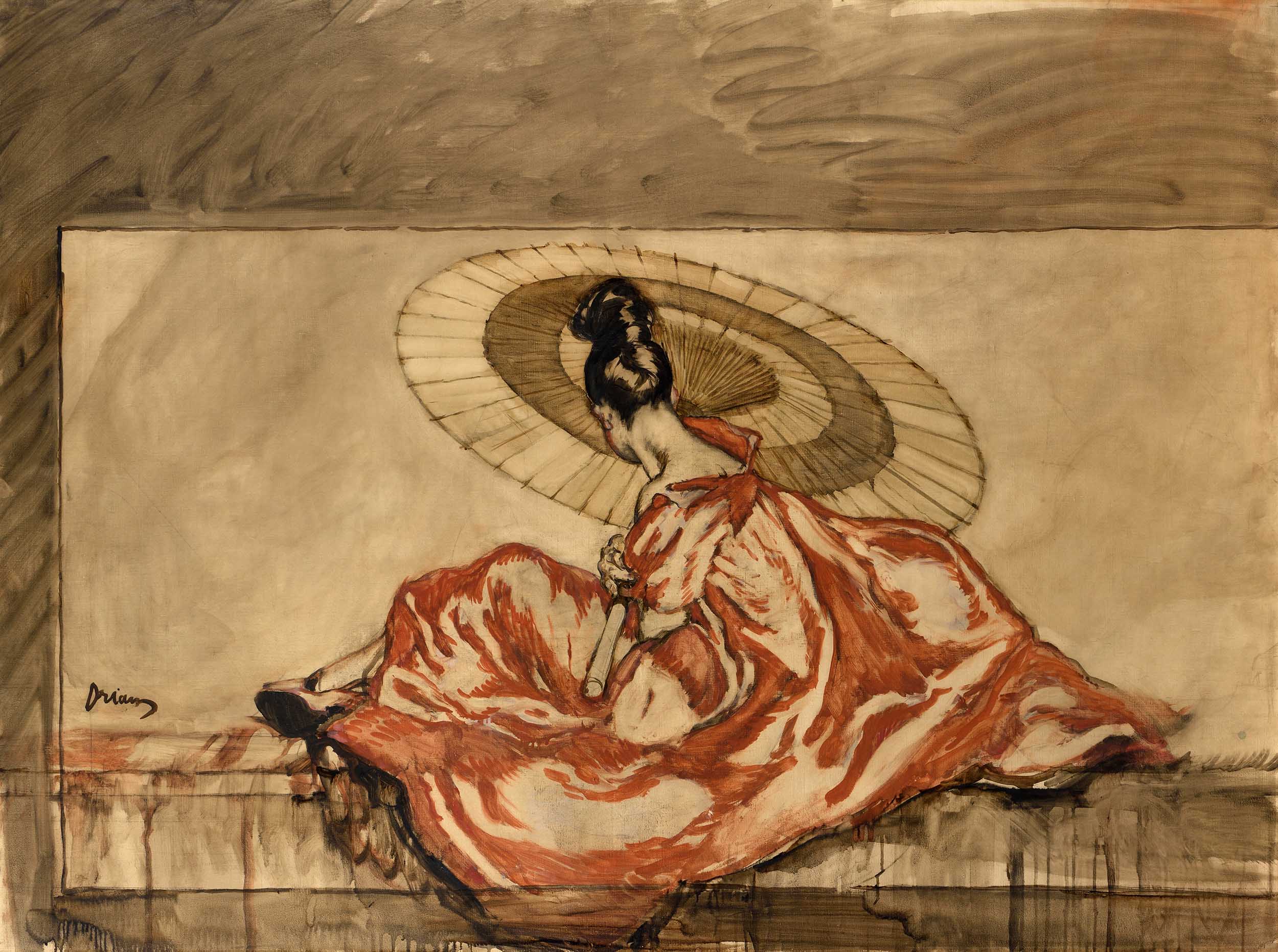 A côté des illustrations, décors, cartons de tapisserie, dessins sur étoffes ou maquettes de meubles, Drian a également peint et dessiné au pastel et à l’aquarelle. L’artiste exécute essentiellement des natures mortes et des portraits mais également de grands formats comme notre Femme à l’ombrelle. Sur une rambarde de pierre, une jeune femme vêtue d’une ample robe rouge et tenant une ombrelle japonaise se détourne du spectateur pour regarder au lointain. On retrouve ici le don de Drian pour restituer les attitudes en suspens, esquisser un geste, donner un sens à l’éphémère. Sa technique accentue cette impression de légèreté : la préparation grise est à peine couverte de légers lavis. Notre peinture est probablement une étude préparatoire pour un grand paravent de 5 feuilles conservé en collection particulière[1], comme le laisse penser la similitude des sujets et le recadrage à mi-hauteur de notre toile. Nous retrouvons également la même figure, mais inversée, dans une peinture sur miroir exécutée par l’artiste vers 1929 pour décorer l’appartement de M. et Mme G. Shiff-Giorgini[2].