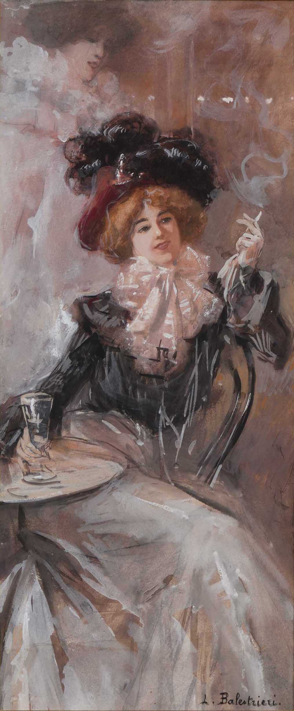 Dans un café, une jeune femme en habit noir et blanc consomme un verre d’absinthe tout en fumant une cigarette. Fabriquée par les machines de la révolution industrielle depuis les années 1870, proposée par la Régie des Tabacs dans des « bondons » de vingt modules de divers tabacs (américain, français, levantin), la cigarette a déjà gagné l’estime des consommateurs masculins quand les femmes de la bonne société l’adoptent dans les années 1900. Une femme qui boit de l’alcool et qui fume, voilà qui n’est pas banal dans une société encore très intolérante. Les manuels de savoir-vivre (celui de la baronne de Staff, entre autres) soulignent à l’envi l’incorrection de la boisson alcoolisée et de la fume au féminin. Mais la beauté du vêtement, l’élégance du geste, le soin de la tenue confèrent à notre jeune femme de vingt ans une attitude résolument « moderne » et très représentative du Paris Belle Époque des années 1900.