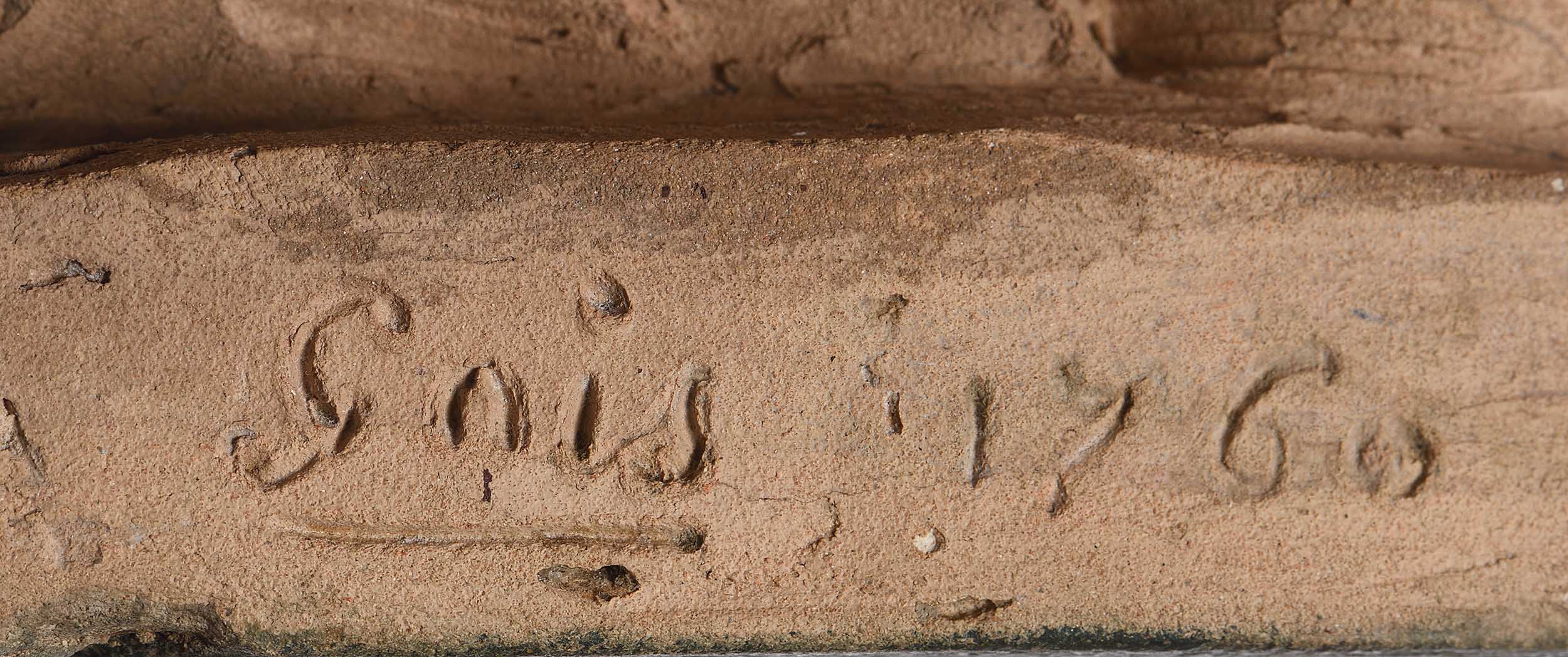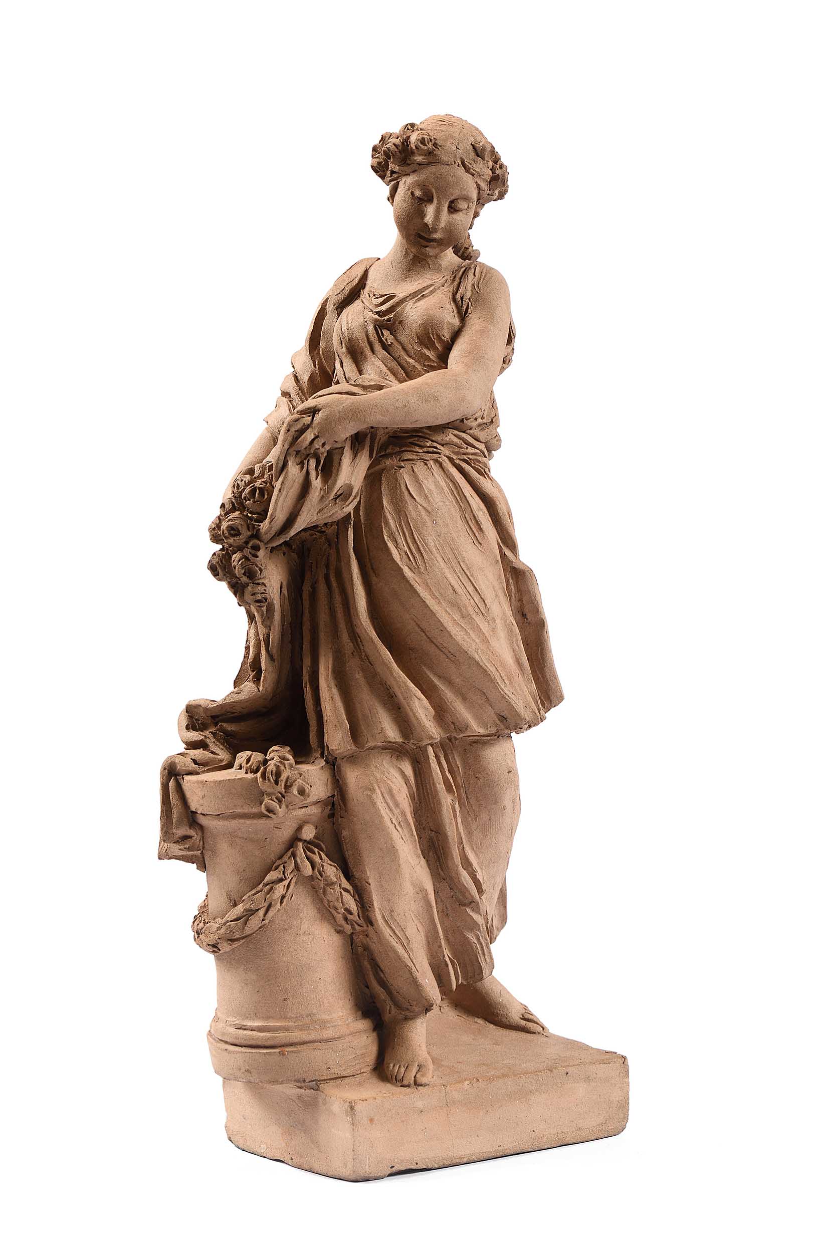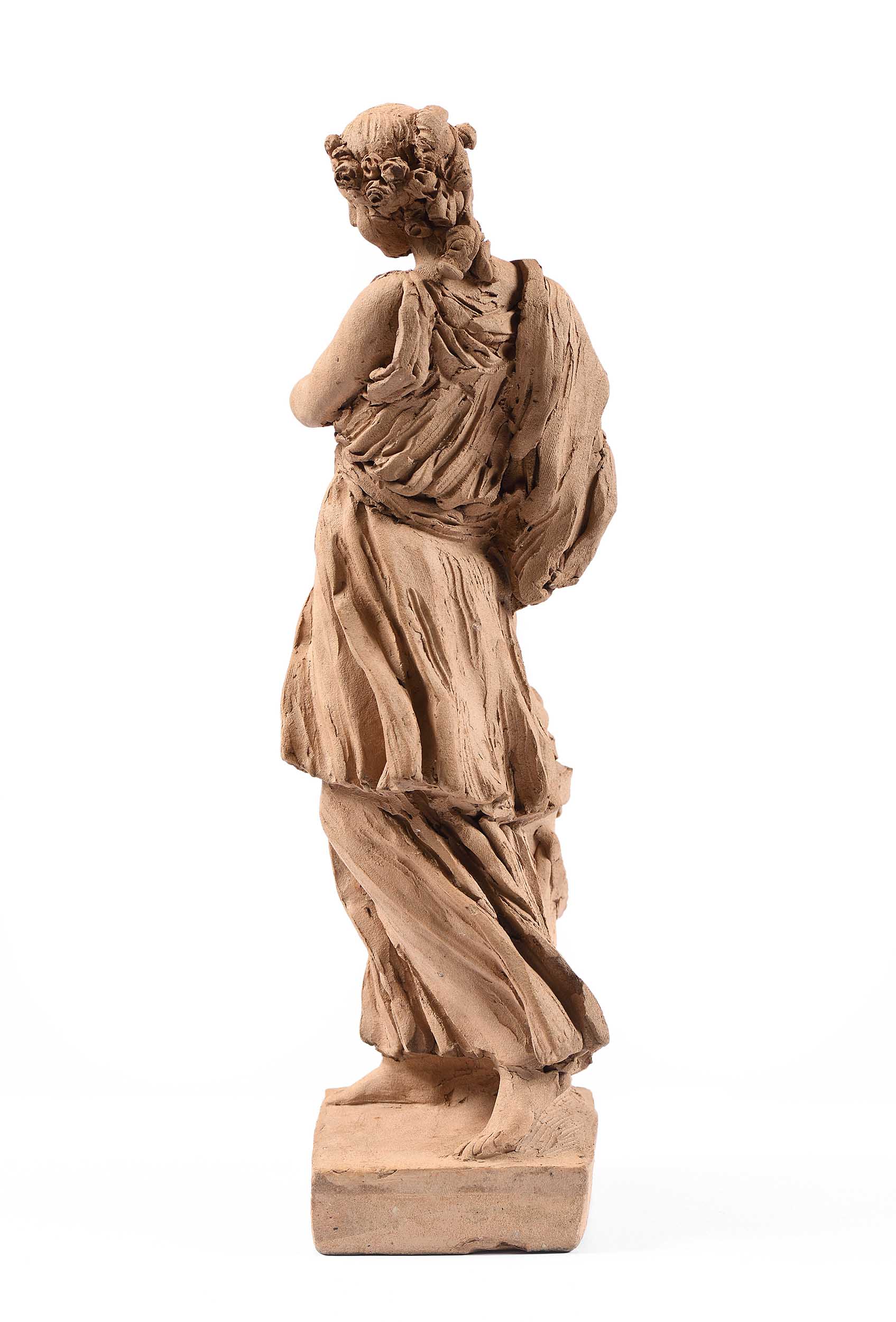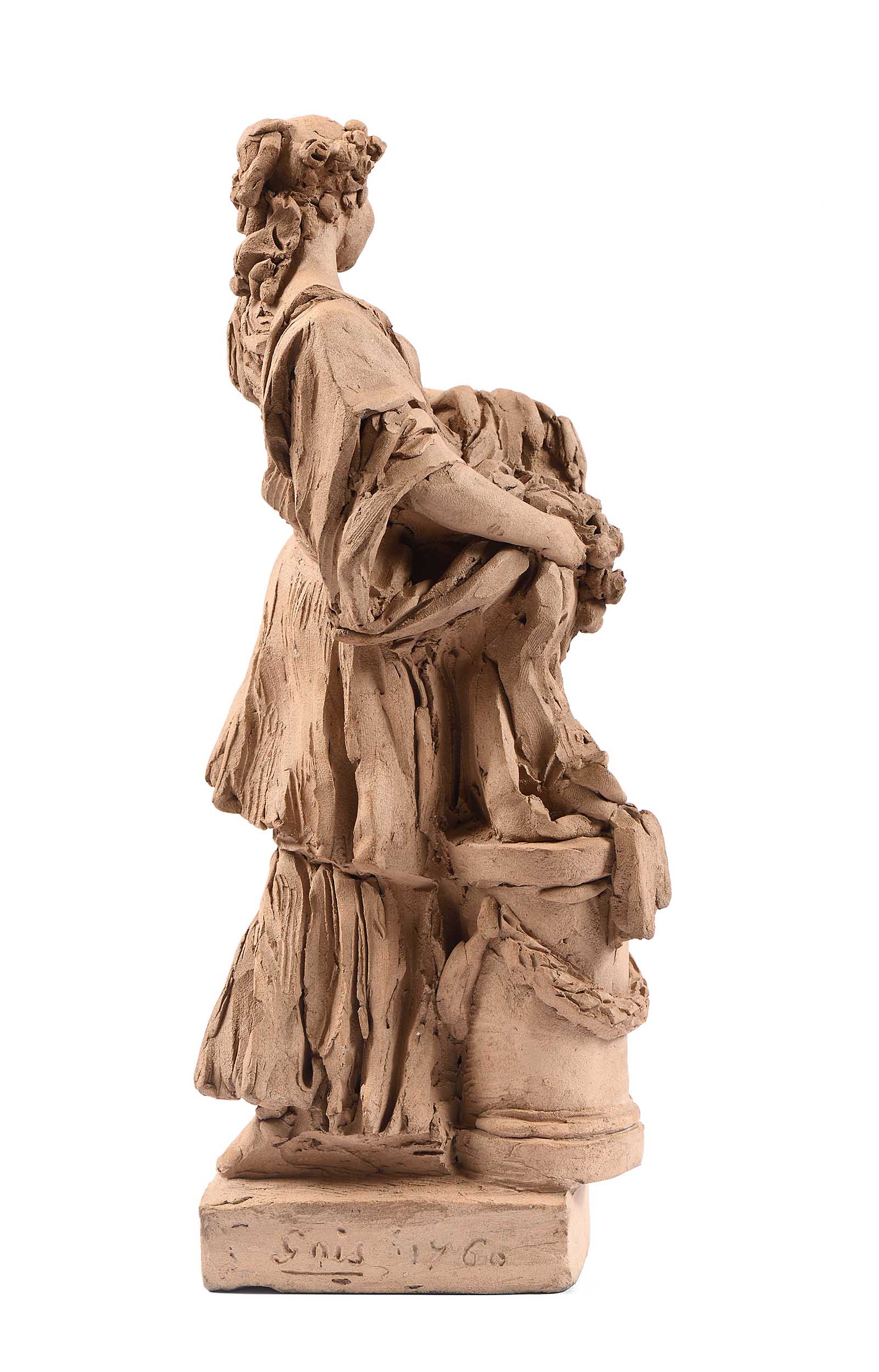 Datée 1760, notre sculpture peut être placée précisément au tout début de la carrière de l’artiste, entre la sortie de l’École des Élèves protégés et le départ pour l’Italie. Avec le buste de son père (fig. 1), il s’agit des deux premières œuvres datées de l’artiste. Notre Prêtresse antique, vêtue d’une tunique aux amples plis flottants et couronnée de roses, tient dans ses deux mains, dans une écharpe, des fleurs qu’elle laisse tomber sur un autel orné d’une guirlande, placé à ses côtés. On retrouve ici tous les éléments caractéristiques du style de l’artiste : une conception d’ensemble large et vive, travaillée à l’ébauchoir, qui contraste avec le traitement des détails - visages, mains et chevelures - nerveusement fouillés ; un type féminin aux formes amples ; une petite tête aux joues rebondies. Les conditions de réalisation de cette œuvre nous sont inconnues. Pour un artiste jeune, même lauréat du grand prix de Rome, les commandes devaient être rares : il faut plutôt penser à une pièce destinée au milieu familial ou amical. La mode était alors à la petite statuaire en terre cuite, destinée à orner bibliothèques et cabinets d’amateurs, et notre sculpture s’inscrit clairement dans ce courant.