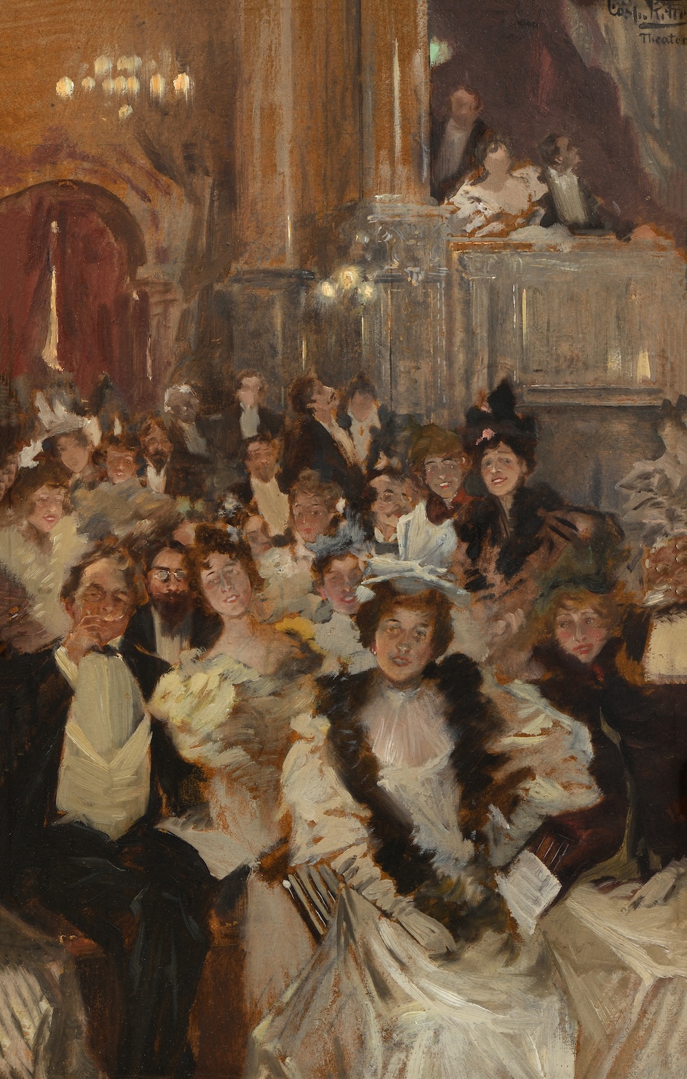 C’est cette bonne société allemande que Caspar Ritter choisit de représenter dans notre charmante salle de théâtre. Dans une salle à la lumière chaude et tamisée, des femmes et des hommes luxueusement parés semblent attendre le début d’une représentation. L’atmosphère est à l’allégresse et des sourires s’esquissent sur les visages de cette joyeuse assemblée, un peu chaotique. Par une facture libre, Caspar Ritter insuffle, en quelques coups de pinceau, une grande vivacité à ce portrait de groupe, où les personnages semblent croqués « sur le vif ». De façon atypique, ils fixent le spectateur du regard, comme si celui-ci était lui-même devenu le spectacle que l’assistance attend.