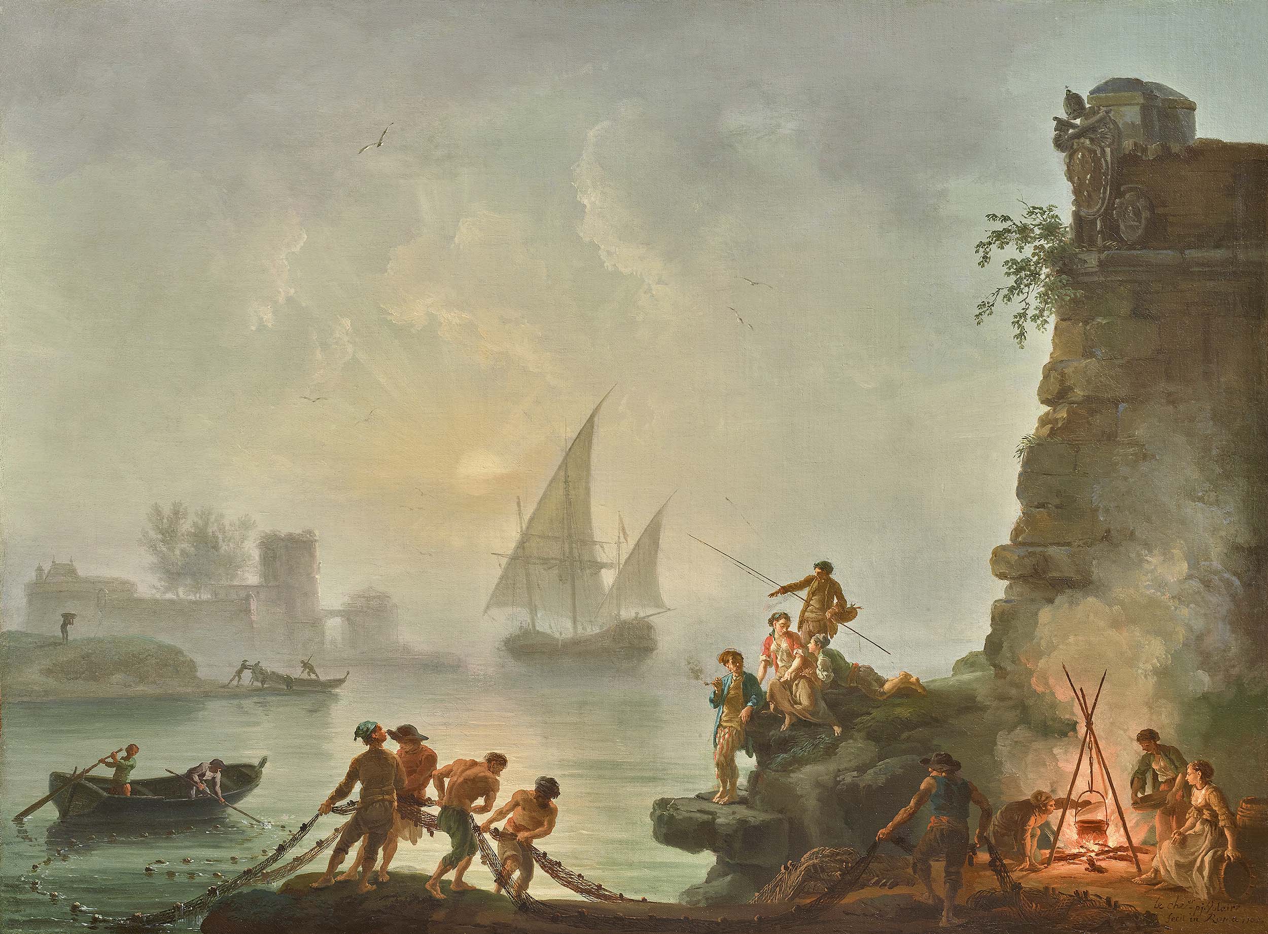Nos deux tableaux, Bord de mer avec des pêcheurs et Marine avec des baigneurs, sont signés et datés de 1767 et 1768, soit une période qui correspond à la fin de sa période romaine. Ayant particulièrement bien réussi financièrement, ce qui lui permettait de vivre noblement, Volaire ajoute alors à son nom le titre de Chevalier que l’on retrouve ici dans les signatures. Ils peuvent être rapprochés d’une série des Quatre heures du jour commandée vers 1766 par le prince d’Anhalt-Dessau et conservée au château de Wörlitz. En particulier, on retrouve la même composition et les mêmes baigneurs dans notre Marine et dans la Marine avec des baigneurs de Wörlitz[1]. Il est donc possible que notre paire de peintures aient fait partie à l’origine d’une suite comparable de quatre paysages ; dans ce cas, il s’agirait de la représentation du Matin et de L’Après-midi. On peut alors tenter de rapprocher nos deux toiles de celles qui composaient la série des Quatre heures du jour peinte pour Louis-César-Renaud, duc de Choiseul-Praslin (1712-1785), passées aux enchères avec sa collection, à Paris, en 1793, les dimensions correspondent à celles de nos tableaux et qui étaient ainsi décrites dans le catalogue de vente : « Volaire. Disciple de Vernet. N°178 Quatre tableaux de même forme & mesure représentant les quatre heures du jour sous différents sujets de marine & de paysage avec diverses figures analogues & avantageusement distribuées. Ces morceaux, peints avec hardiesse et précision, offrent des productions intéressantes de cet élève distingué du célèbre Vernet. Haut. 20 p. larg. 26. T. » Ce lot a été acquis par le marchand Jean-Baptiste Pierre Le Brun (1748-1813) pour la somme de 1180 francs.