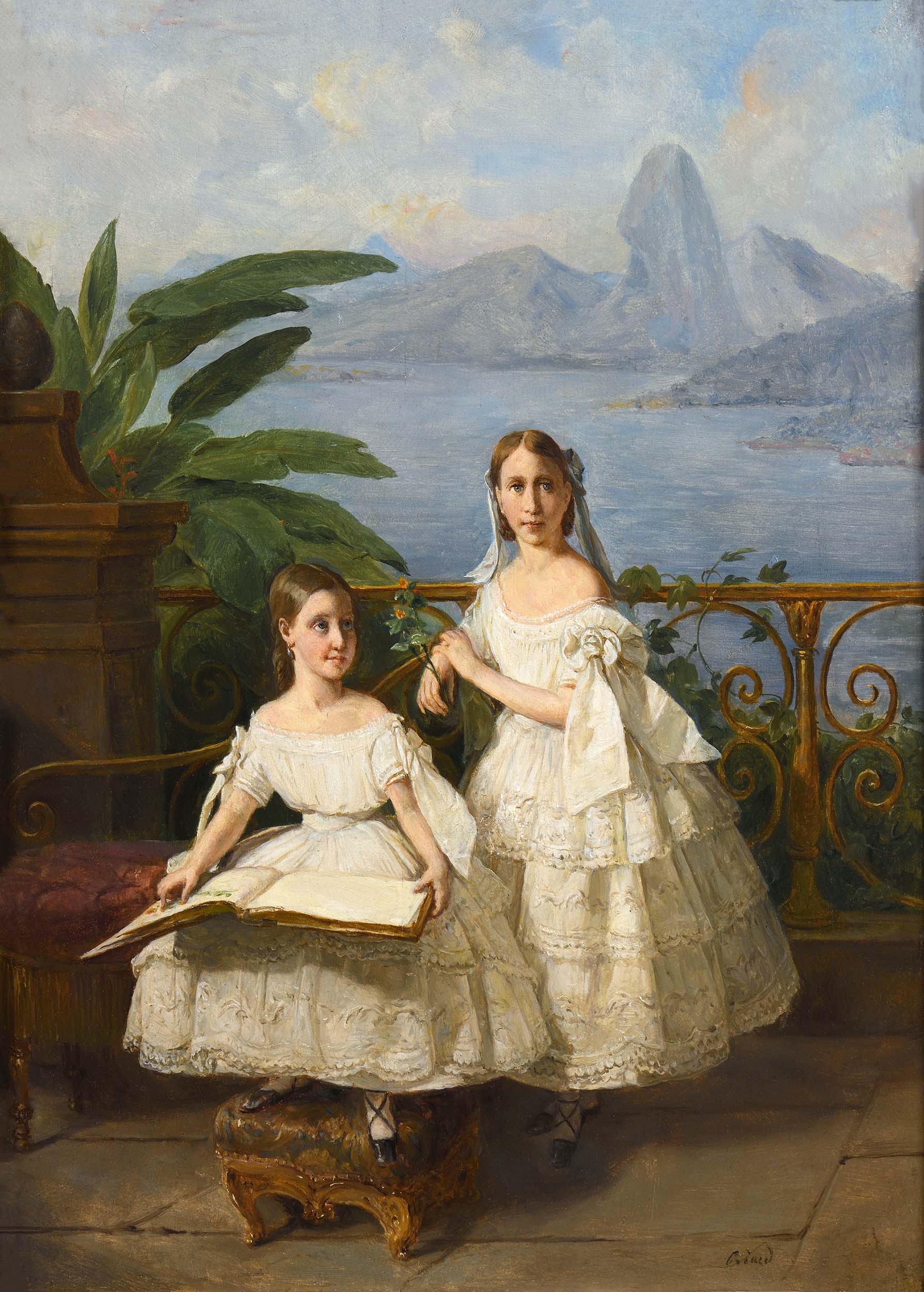 Ici, Biard représente Isabelle du Brésil (1846-1921) et sa sœur Léopoldine (1847-1871). Sur une terrasse au milieu d’un jardin luxuriant, Léopoldine, alors âgée de 8 ans, est assise sur une chaise longue, les pieds reposant sur un tabouret, tenant un livre ouvert entre ses mains. Au contraire, Isabelle, 11 ans, est debout, le regard fixé droit vers le spectateur et son visage est placé au centre de la composition, juste devant la baie de Rio de Janeiro, dominée par le monolithe de granit appelé mont du Pain de Sucre (Pão de Açúcar). Dans la version définitive, ce paysage disparaitra, de manière à concentrer plus l’attention sur les deux fillettes. Cette position d’Isabelle, centrale et hiératique, n’est pas sans rappeler, de manière délibérée, la tradition du portrait royal en pied, récemment illustré par Biard dans le portrait de ses parents : il s’agit d’illustrer le statut central de la jeune femme qui est devenue, en 1850, à la suite à la disparition du dernier fils de Pedro II, la princesse héritière du Brésil.