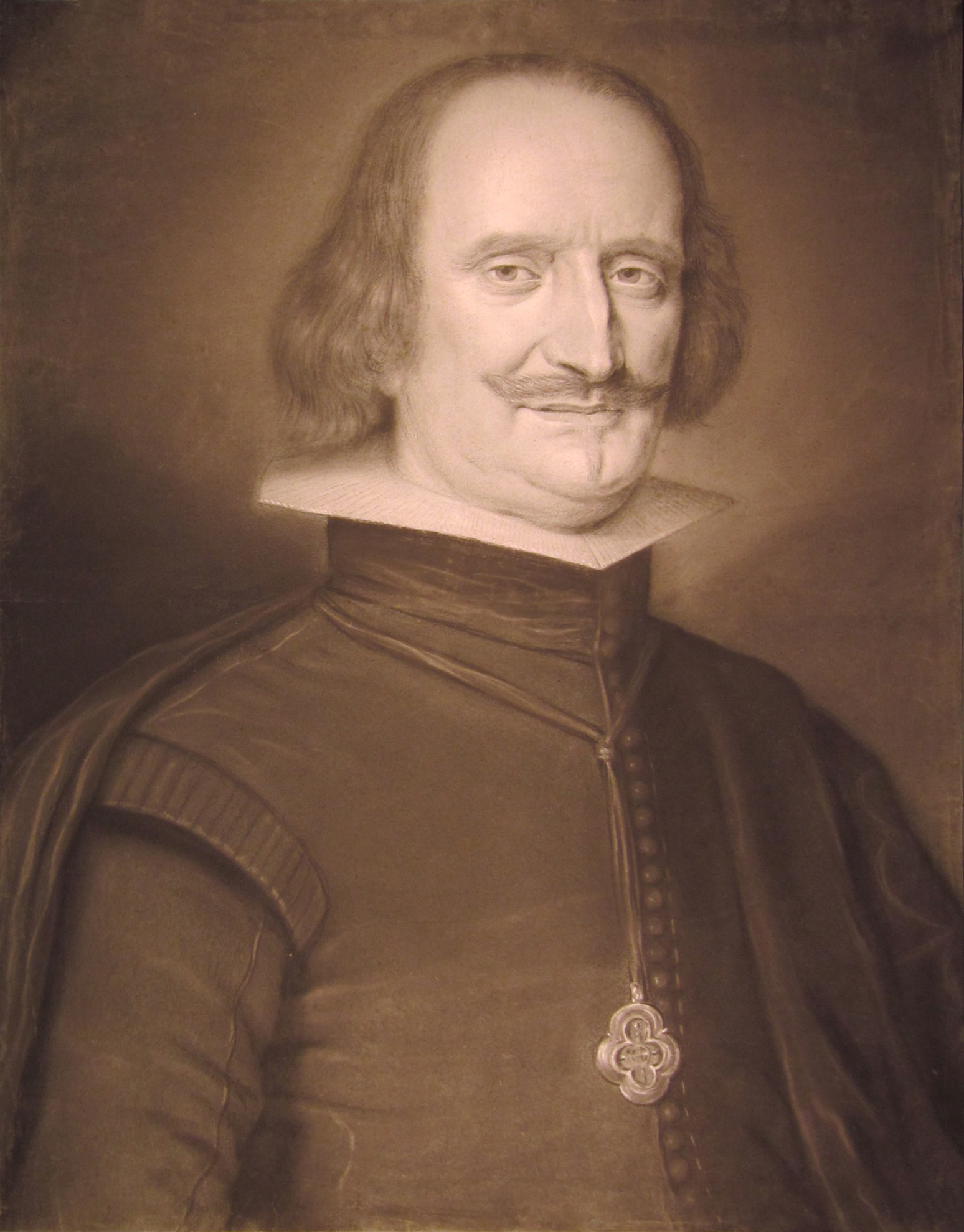 Notre portrait représente l’ambassadeur espagnole, Gaspar de Bracamonte y Guzman, comte de Peñaranda (1595-1676). Issu de l’une des familles les plus anciennes et les plus nobles d'Espagne, les Guzman, une famille présente dans l’histoire du pays à travers diverses branches et divers représentants, Gaspar est le fils d’Alonso de Bracamonte, premier comte de Peñaranda. Il dirige la délégation espagnole aux négociations qui aboutissent à la paix de Westphalie en 1648, puis représente le roi d’Espagne lors de l’élection de Léopold Ier à Francfort en 1659. Entre 1659 et 1664, il est vice-roi de Naples avant de devenir, après la mort de Philippe IV en 1665, l’un des régents du royaume d’Espagne et conseiller de la reine douairière Marianne d’Autriche, qui exerce la régence au nom de son fils Charles II. Dans notre portrait, Peñaranda revêt le costume espagnol typique des années 1650, habit noir et col plat. En effet, depuis le décret somptuaire de 1623, Philippe IV a interdit les collerettes « fraise » d’une hauteur démesurée pour raisons d’économie et impose le port du col plat dit aussi golilla. En sautoir, Gaspar de Bracamonte porte le médaillon de l’ordre d’Alcantara dont il est membre. On retrouve également le symbole de cet ordre, brodé, sur la cape à droite. Notre dessin a été gravé peu après sa réalisation en 1658 (ill. 1).