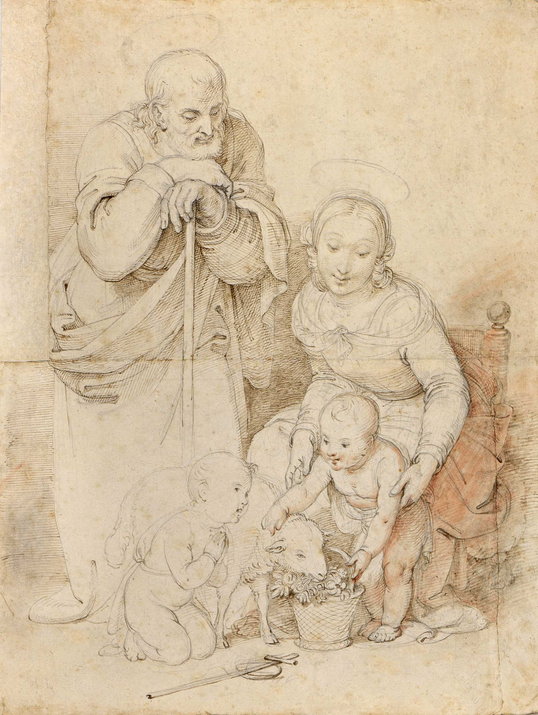 L’activité théorique et formatrice de Minardi étant très importante, ses peintures sont assez rares. Cependant, selon Francesco Hayez, Minardi bénéficiait d’une « facilità immensa » pour dessiner, ce qui fait de l’artiste l’un des plus féconds dessinateurs du début du XIXe siècle. Notre feuille avec la Sainte famille avec saint Jean Baptiste peut ainsi se comparer avec d’autres œuvres de l’artiste comme La Vierge agenouillée en adoration devant l’Enfant Jésus (plume et encre brune, rehauts de blanc, Rome, Galleria Nazionale d’Arte Moderna)[1] ou avec une Sainte famille très proche, signée et datée 1814, conservée dans une collection particulière. On retrouve dans toutes ces feuilles le même goût très affirmé de l’artiste pour les œuvres du Pérugin, soigneusement étudié par Minardi durant son séjour à Pérouse, entre 1817 et 1821. Notre dessin doit donc pouvoir être daté de cette période, époque durant laquelle l’influence de l’art d’Ombrie sera la plus présente chez Minardi.