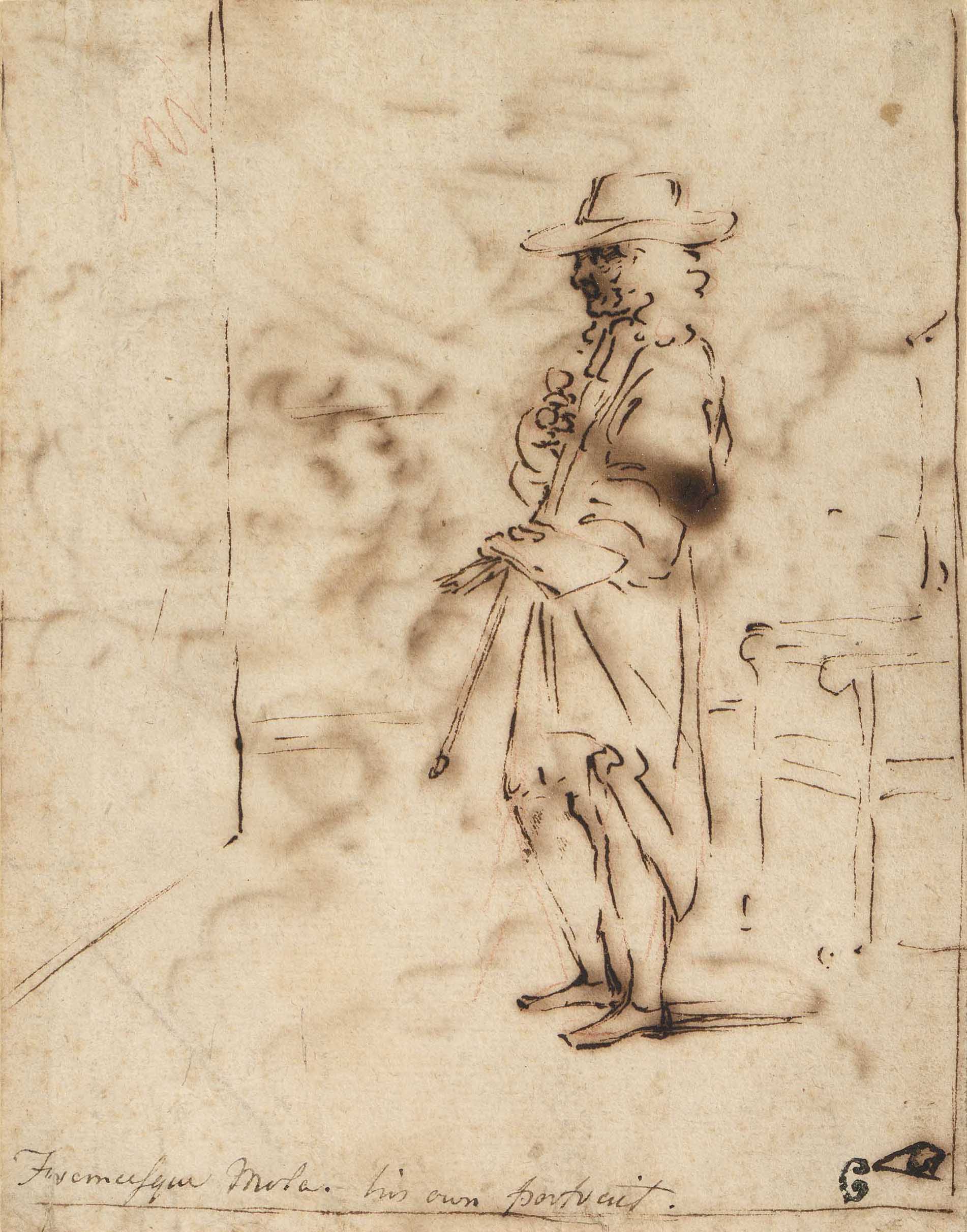 L’artiste s’est fréquemment livré à l’exercice du portrait, qui le conduit à la caricature. Beaucoup de celles-ci représentent des membres du clergé, tandis d’autres chargent le monde de l’art et les amis de l’artiste, Rosa, Testa ou Simonelli, certaines enfin sont autobiographiques[1]. Même si l’inscription portée en anglais sur le bas du dessin est ancienne, elle est cependant à prendre avec précaution, les portraits de l’artiste étant très rares. Le dessin exécuté au verso de notre feuille, une esquisse de composition pour un Daniel dans la fosse aux lions, n’a pu être mis en relation avec aucune œuvre connue de l’artiste.